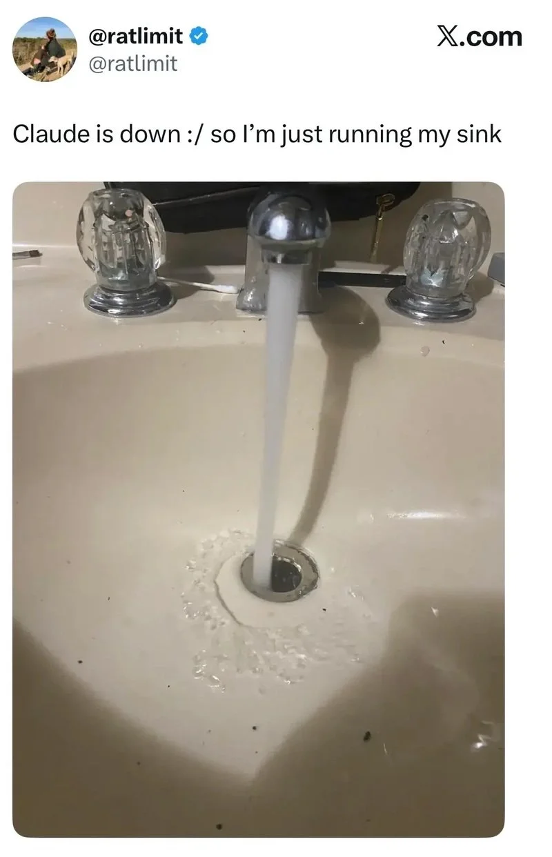 I think the answer is to leave the tap running if my favorite AI is not working. Leave a few lights on, I think that will help the powers that be feel satisfied that I’m truly destroying the planet for them.